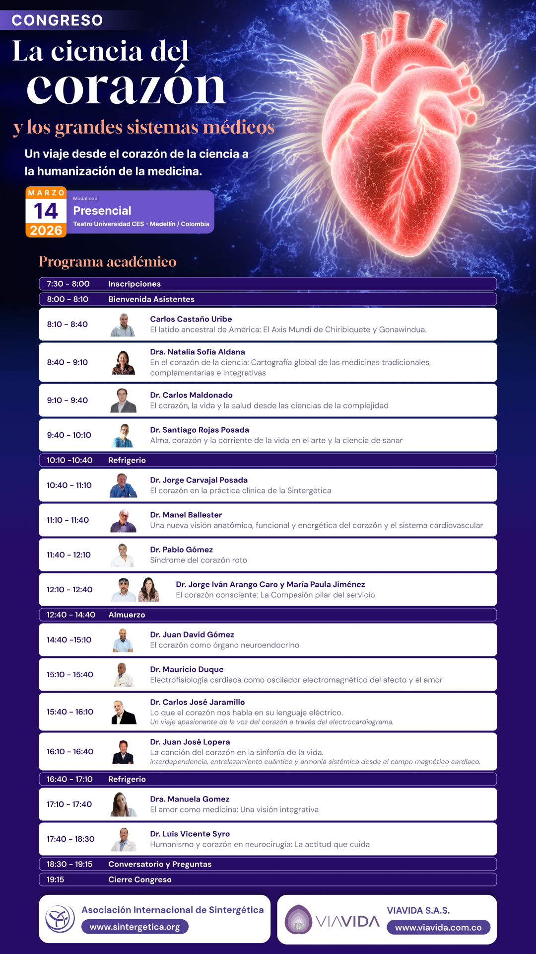 Organizado por la Asociación Internacional de Sintergética (AIS) y Viavida, el Congreso La Ciencia del Corazón es una invitación abierta a todas las personas, sin importar su profesión o experiencia previa, a reconectar con lo más humano en una era dominada por los algoritmos.
