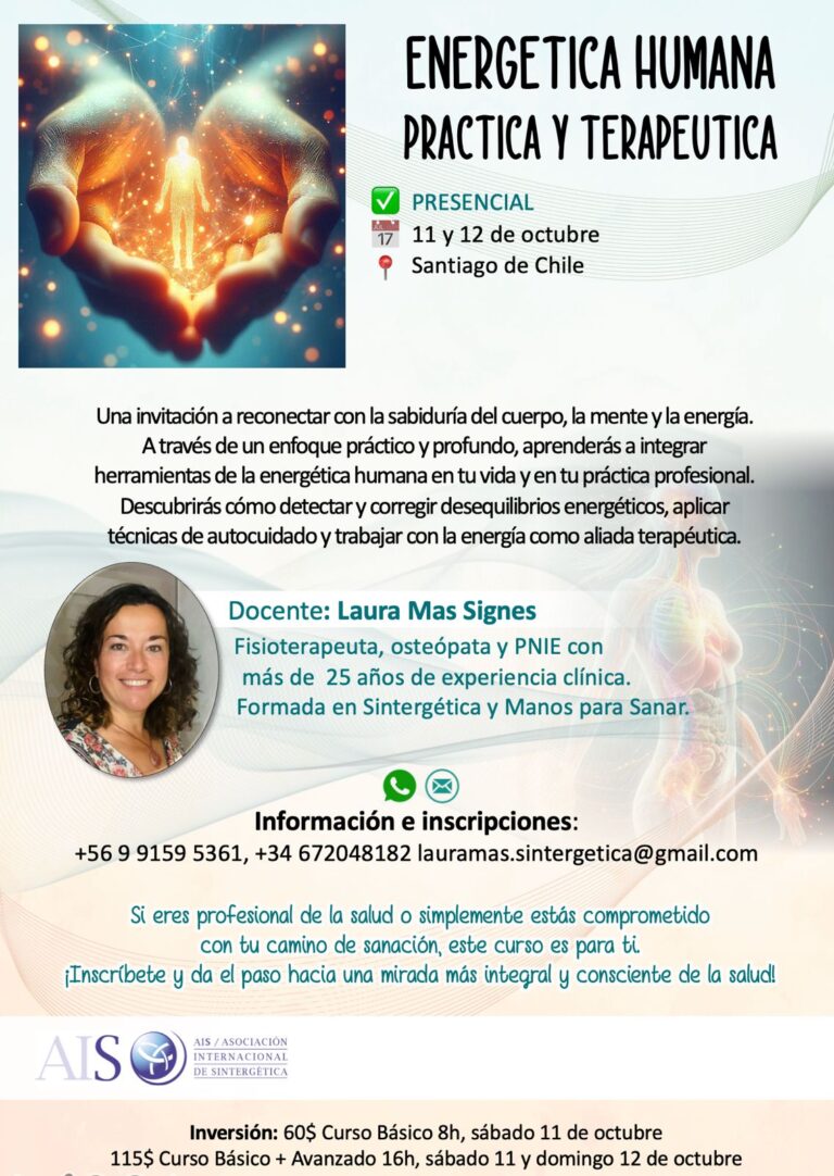 Forma parte del Curso Salud y Energética Humana: Práctica y Terapéutica, que tendrá lugar los días 11 y 12 de Octubre en Santiago de Chile.